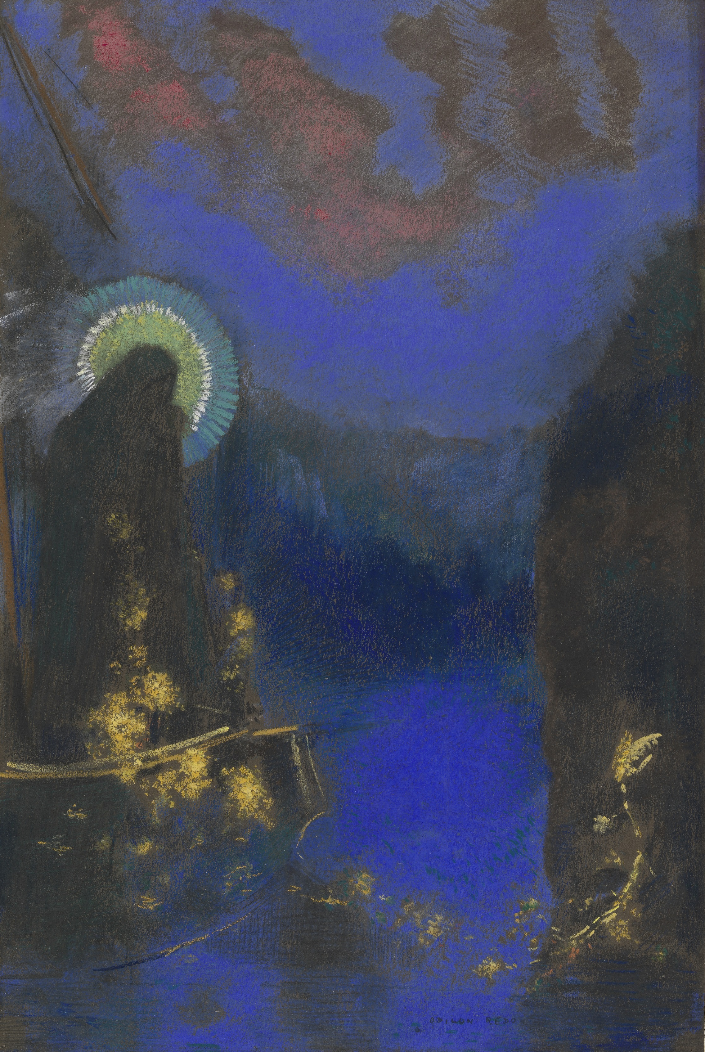 Deze plotse betiteling is enigszins verrassend, omdat Redon het werk 14 jaar eerder in zijn eigen rekeningenboek totaal anders vermeldt. Daar kent het nog geen titel, enkel een schematische beschrijving: Ciel sombre brun avec nuages violet et rouge, à gauche un être auréolé sur une barque. Des gerbes d’or à la proue de la barque, et sur les eaux une sorte de fosforescence bleue, comme un feu–follet.
